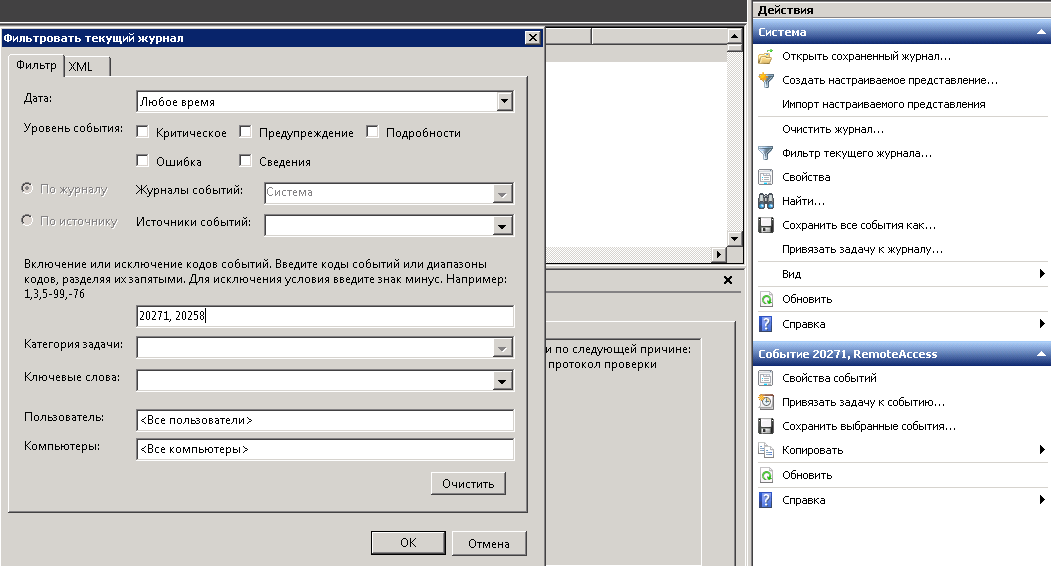 Давайте смотреть логи в просмотре событий на данном сервере. Открываем оснастку и переходим в раздел Система. Ловить мы будем Код события 20271 и Код события 20258