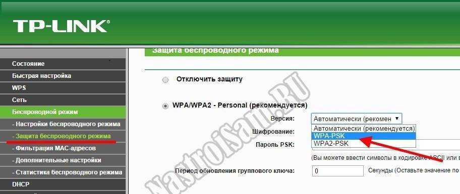 Ещё один вариант, который может помочь устранить ошибку аутентификации — смена версии стандарта безопасности. Это часто спасает и в случае использования старых телефонов с Вай-Фай и при использовании новомодных Айфонов и Андроида. И если со старыми аппаратами понятно — те просто с WPA2-PSK работать не умеют. То в случае с новыми устройствами проблема чаще всего в прошивке маршрутизатора. По какой-то причине он неправильно работает с этим стандартом. Поэтому пробуем сменить его на WPA-PSK:
