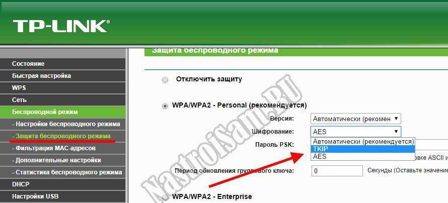 Ещё один способ, который нередко помогает в случае с планшетами и смартфонами на базе операционной системы Android — смена типа шифрования. У большинства роутеров по умолчанию при выборе стандарта безопасности WPA2-PSK автоматически ставится тип шифрования — AES. И это правильно. Но только вот до сих пор встречаются старые версии Андроида, которые с AES не работают. Поэтому его можно попробовать сменить на TKIP. Делается это так же, в параметрах безопасности: