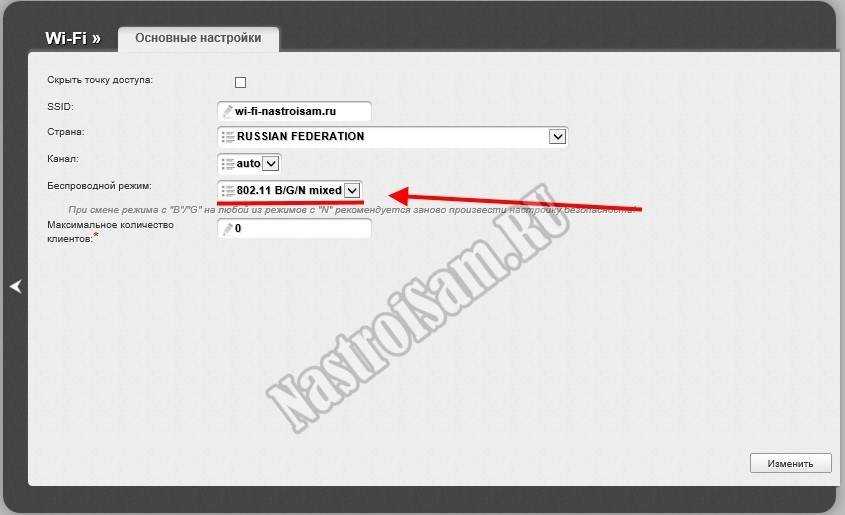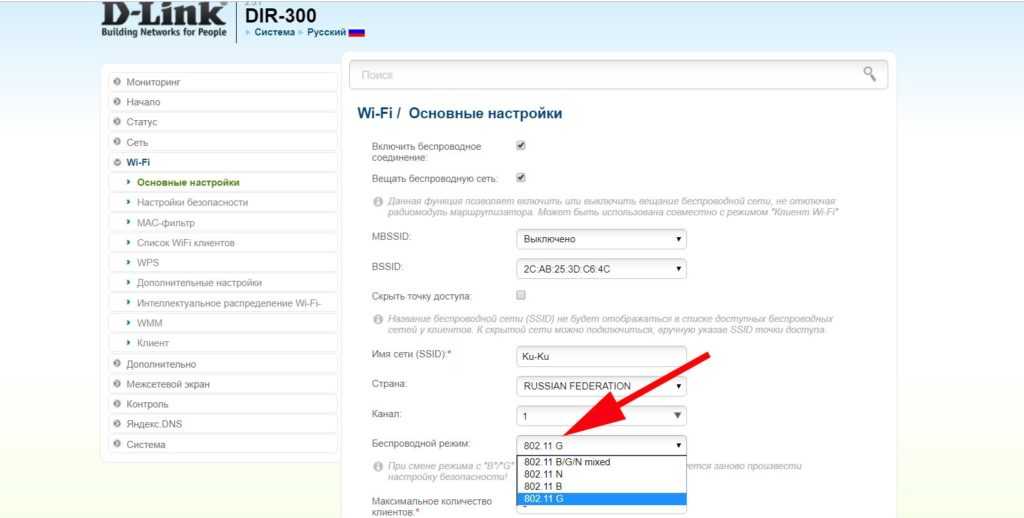 К сожалению, с самым быстрым беспроводным стандартом N300 работать умеют тоже не все устройства, что так же может усугубить ситуацию. Поэтому в настройках беспроводного модуля пробуем сменить режим «B/G» вместо «B/G/N mixed» и посмотреть результат: