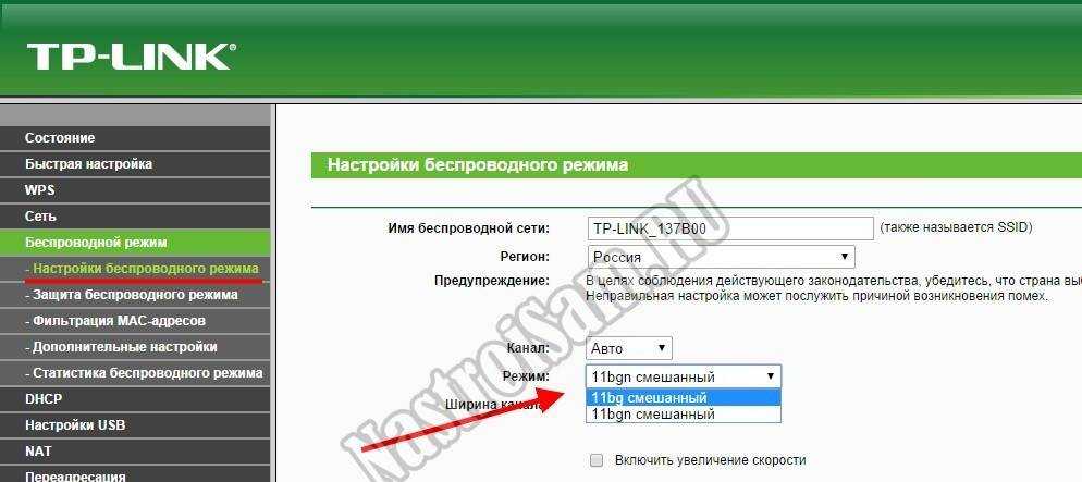 - В загрузившемся окне установите напротив опции Mode такую команду: 11bgn mixed.