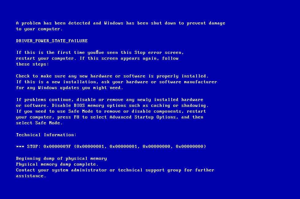 A problem has been detected and Windows has been shut down to prevent damage to your computer. DRIVER_POWER_STATE_FAILURE If this is the first time you’ve seen this Stop error screen, restart your computer. If this screen appears again, follow these steps: Check to make sure any new hardware or software is properly installed. If this is a new installation, ask your hardware or software manufacturer for any Windows updates you might need. If problems continue, disable or remove any newly installed hardware or software. Disable BIOS memory options such as caching or shadowing. If you need to use Safe Mode to remove or disable components, restart your computer, press F8 to select Advanced Startup Options, and then select Safe Mode. Technical Information: *** STOP: 0x0000009F (0x00000001, 0x00000001, 0x00000000, 0x00000000) Beginning dump of physical memory Physical memory dump complete. Contact your system administrator or technical support group for further assistance.