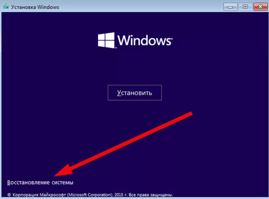 - Вместо кнопки «Установить» выберите пункт «Восстановление системы»;