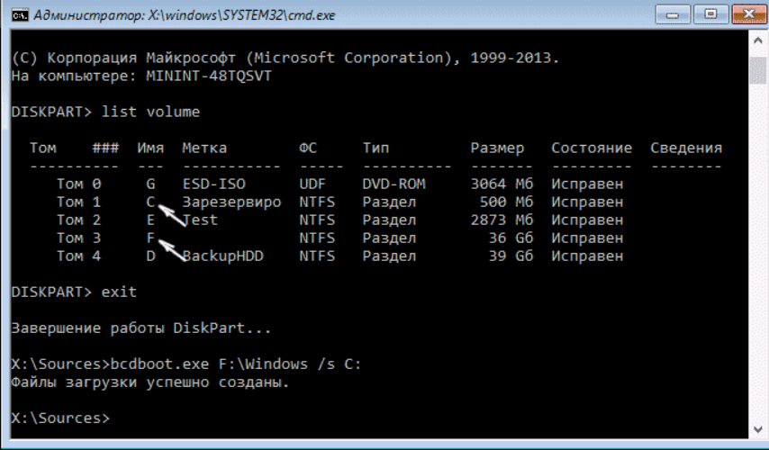 bcdboot.exe C:\Windows /s D: