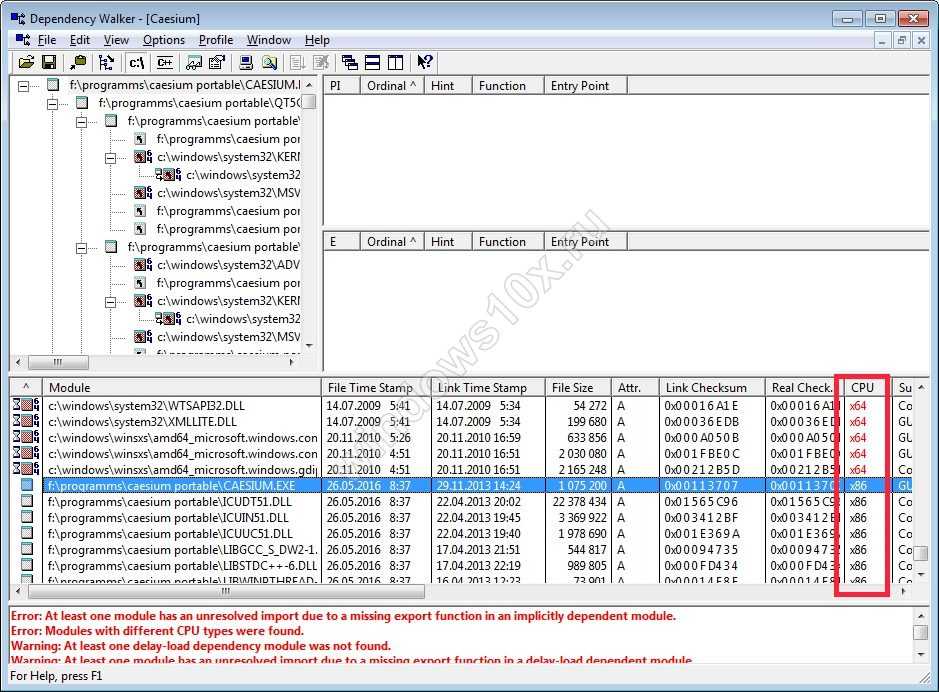 После сканирования в колонке CPU вы увидите подсвеченные красным неправильные версии файлов. Если выделено x64, значит приложение 32-разрядное и нужно скачать соответствующую библиотеку. И наоборот, если выделяет x32 – ищите в сети версию x64.