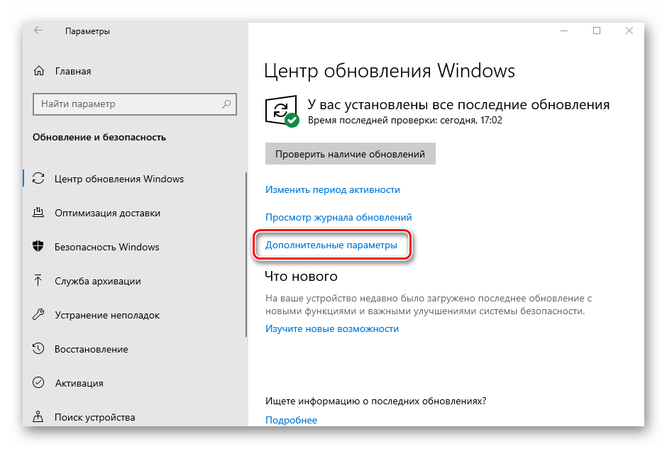 - Пройдите путь: «Пуск» — «Параметры» — «Обновление и безопасность» — «Центр обновлений Windows» — «Дополнительные параметры».