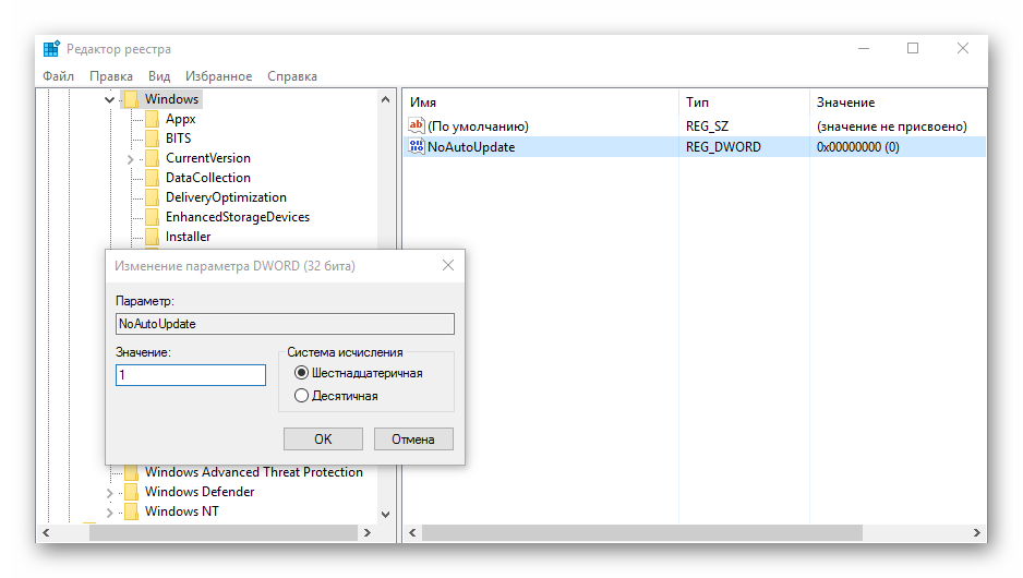 Создайте самостоятельно параметр DWORD. Задайте ему имя «NoAutoUpdate» и внесите в него значение 1.