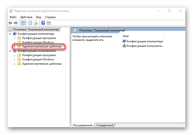 В разделе «Конфигурация компьютера» кликните по элементу «Административные шаблоны».