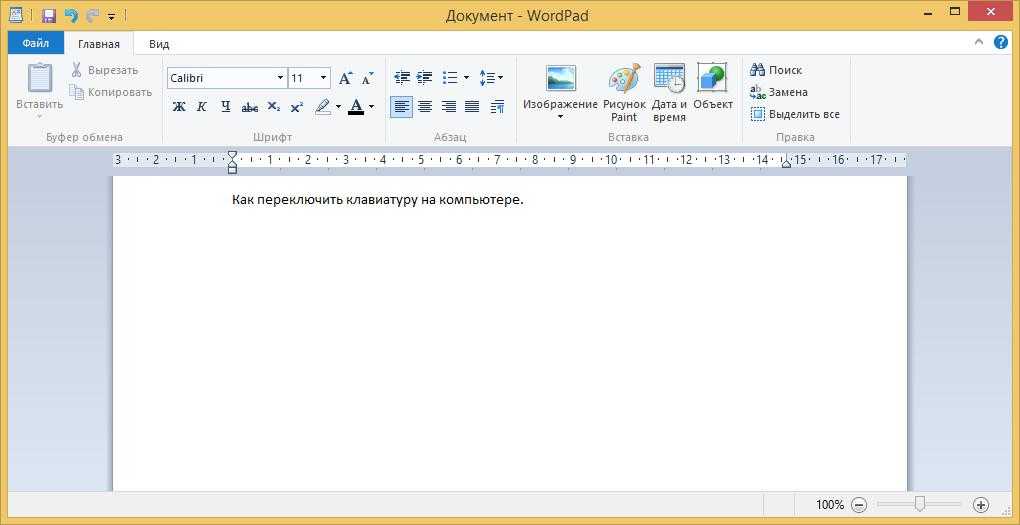 Для примера проверки работоспособности программы введем предложение «Как переключить клавиатуру на компьютере» с включенной английской раскладкой в WordPad. В результате ввода, уже на первом слове, Punto Switcher изменит раскладку на русскую.