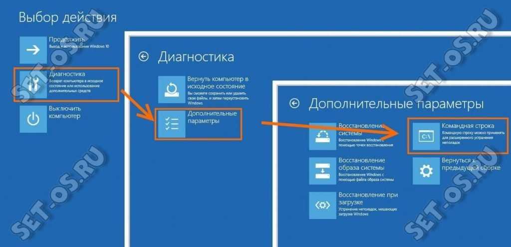 2. Повреждение системного загрузчика. Для того, чтобы его восстановить Вам снова понадобиться установочный диск. Заходим в раздел Диагностика >> Дополнительные параметры и запускаем командую строку:
