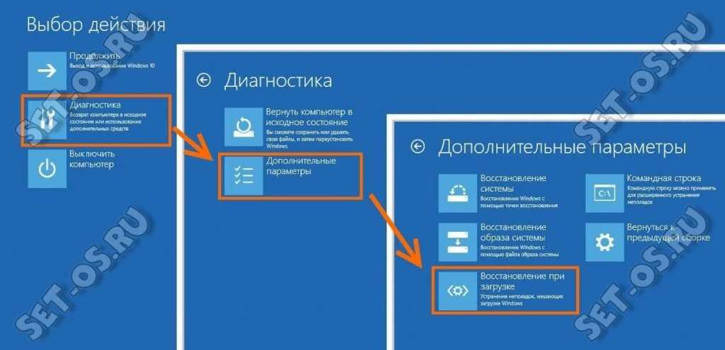 Решением в этом случае будет запуск ОС в режиме Восстановления, загрузившись с установочной флешки Windows. Открываем раздел Диагностика, в следующем окне кликаем на Дополнительные параметры и затем — Восстановление системы.