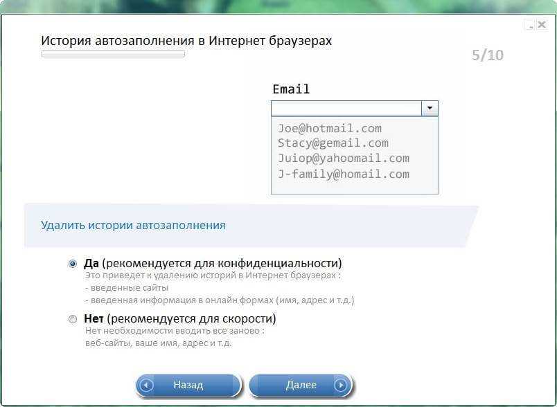 В окне «История автозаполнения в Интернет браузерах» я оставляю настройки по умолчанию, так как часто использую эту функцию.