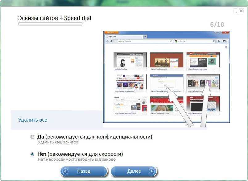 В новом окне «Эскизы сайтов» лучше оставить настройки по умолчанию, иначе будут удалены эскизы сайтов, находящихся в закладках на экспресс панели браузеров или различных расширений визуальных закладок. Нажмите на кнопку «Далее».