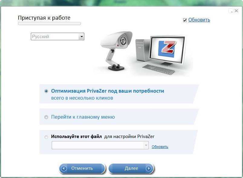 После первого запуска программы вам будет предложено выбрать один из вариантов: перейти к главному меню (я использую этот вариант) или «Оптимизация Privazer под ваши потребности».