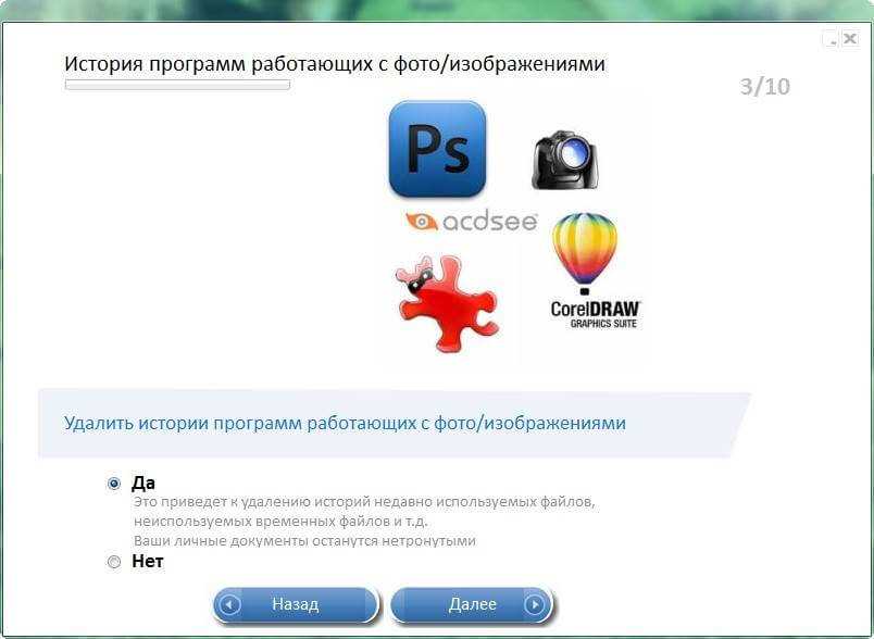 В окне «История программ работающих с фото/изображениями» активируете пункт «Да», а затем нажимаете на кнопку «Далее».
