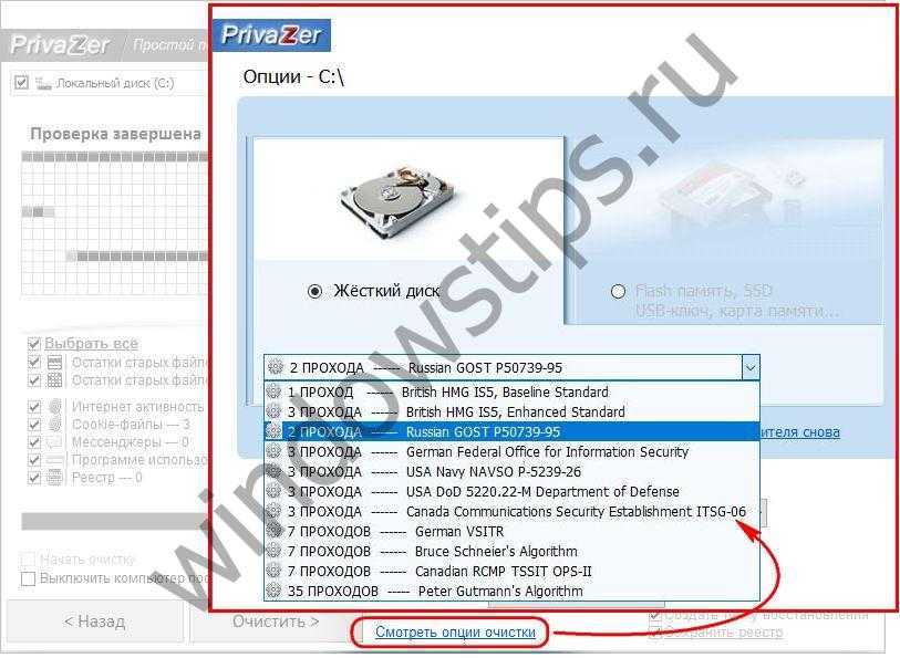 Заметающие следы активности на компьютере и беспокоящиеся о своей конфиденциальности пользователи перед этапом очистки могут сделать еще кое-что: при нажатии ссылки «Смотреть опции очистки» будет доступен выбор числа проходов для носителей данных и оперативной памяти.