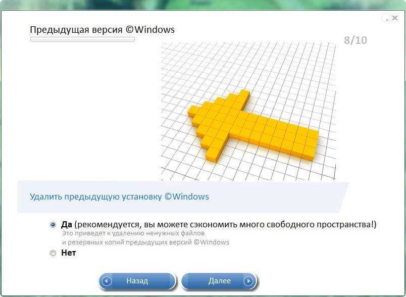 В окне «Предыдущая версия Windows» нажимаете на кнопку «Далее», согласившись с настройками по умолчанию.