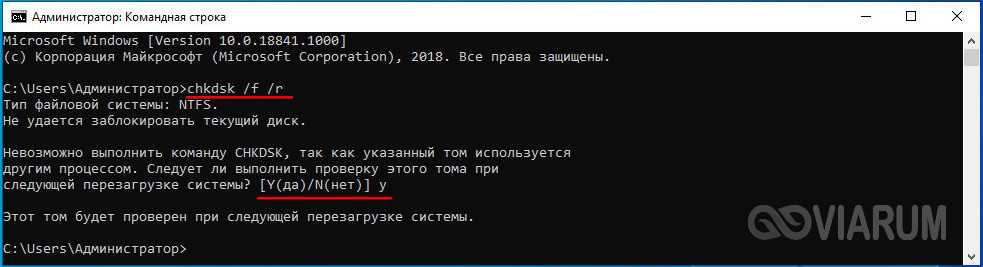 В случае, если вы попробуете проверить жесткий диск, который в настоящее время используется системой, вы увидите сообщение об этом и предложение выполнить проверку после следующей перезагрузки компьютера (до загрузки ОС). Введите Y для того, чтобы согласиться или N, чтобы отказаться от проверки. Если при выполнении проверки вы видите сообщение о том, что CHKDSK недопустим для дисков RAW, то может помочь инструкция: Как исправить и восстановить диск RAW в Windows.