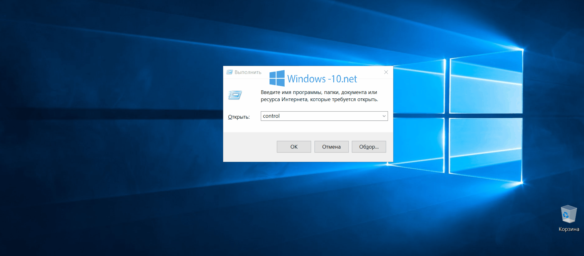 - Нажать WIN + R и ввести в диалоговом окне control;
