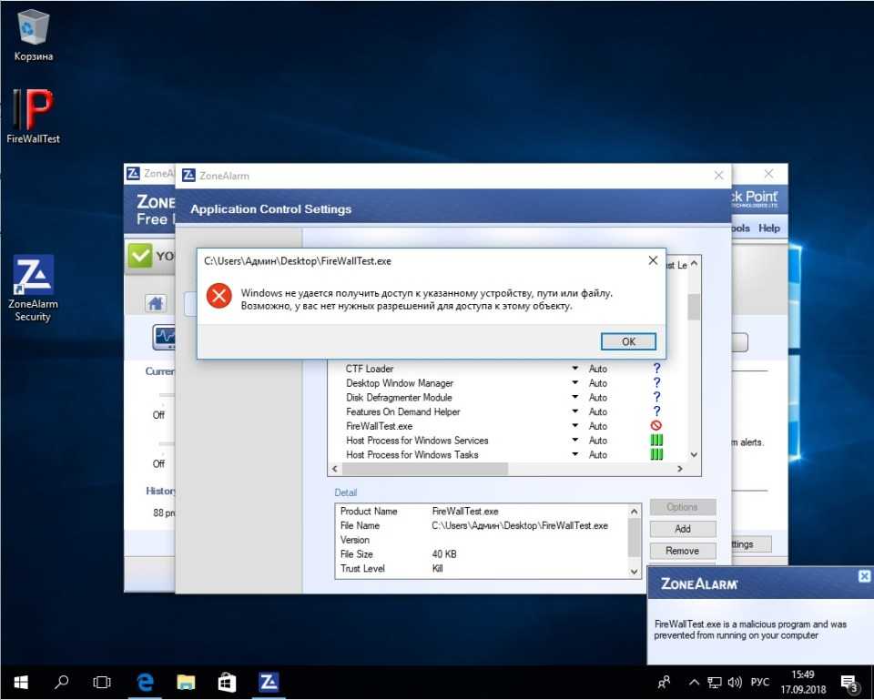 На этот раз файрвол справляется с задачей: появляется окно с кнопками, позволяющими заблокировать обнаруженную угрозу. Третий тест в «параноидальном» режиме программа также проходит успешно, что неудивительно.