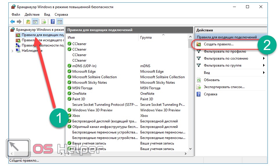 - Открываем вкладку «Правила для входящих подключений» и нажимаем на «Создать правило» в правом меню действий.