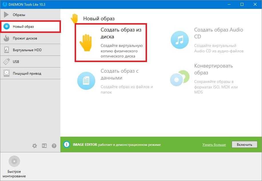 Этот «Дисковод BD-ROM» как раз и является приводом рассматриваемой программы DAEMON Tools Lite. В этом примере мы создадим image оригинального установочного DVD-диска с операционной системой Windows 10. Чтобы сделать из установочного DVD с десяткой образ, вставим его в DVD-привод. Теперь запустим утилиту и перейдем в раздел «Новый образ».