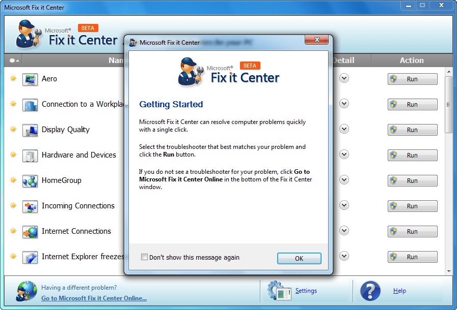 Программа Microsoft Fix It работает в среде поиска и устранения неполадок ОС Windows