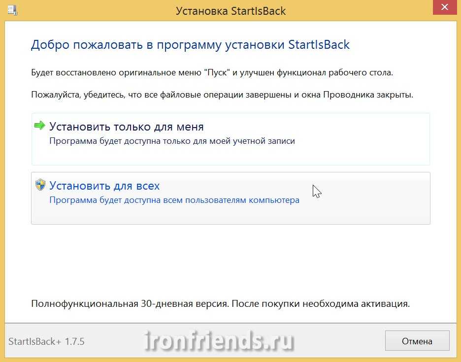 Установка программы происходит в один этап — нужно только выбрать, установить ли меню Пуск для одного пользователя или же для всех учетных записей на этом компьютере. Сразу после этого, все будет готово и будет предложено настроить новое меню пуск. Также по умолчанию отмечен пункт «Показывать рабочий стол вместо начального экрана при загрузке», хотя для этих целей можно воспользоваться и встроенными средствами Windows 8.1.
