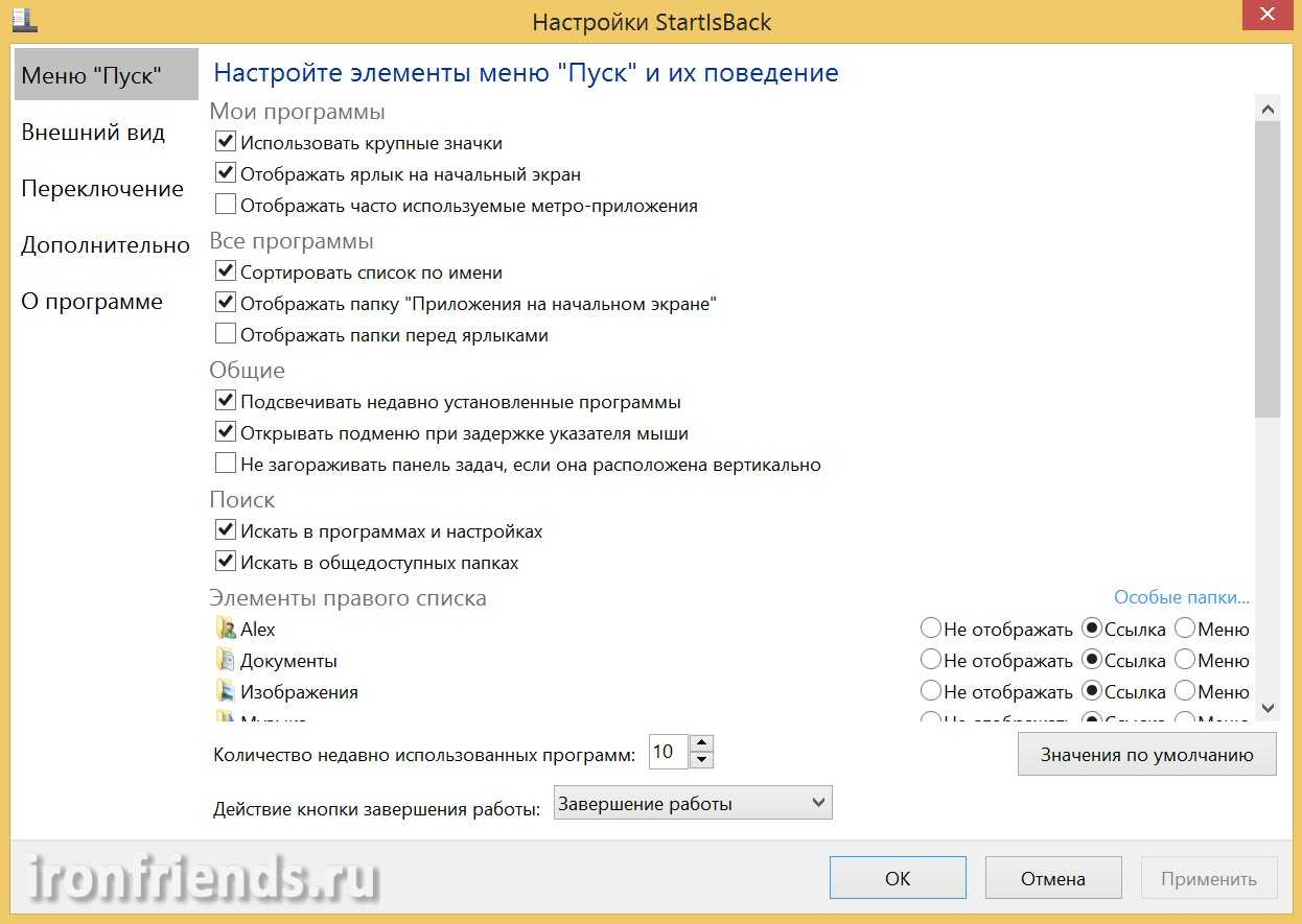 Сам по себе пуск полностью повторяет тот, к которому вы могли привыкнуть в Windows 7 — абсолютно та же организация и функциональность. Настройки, в общем-то аналогичны, за исключением некоторых, специфичны для новой ОС — такие как отображение панели задач на начальном экране и ряд других. Впрочем, смотрите сами, что предлагается в настройках StartIsBack Plus.