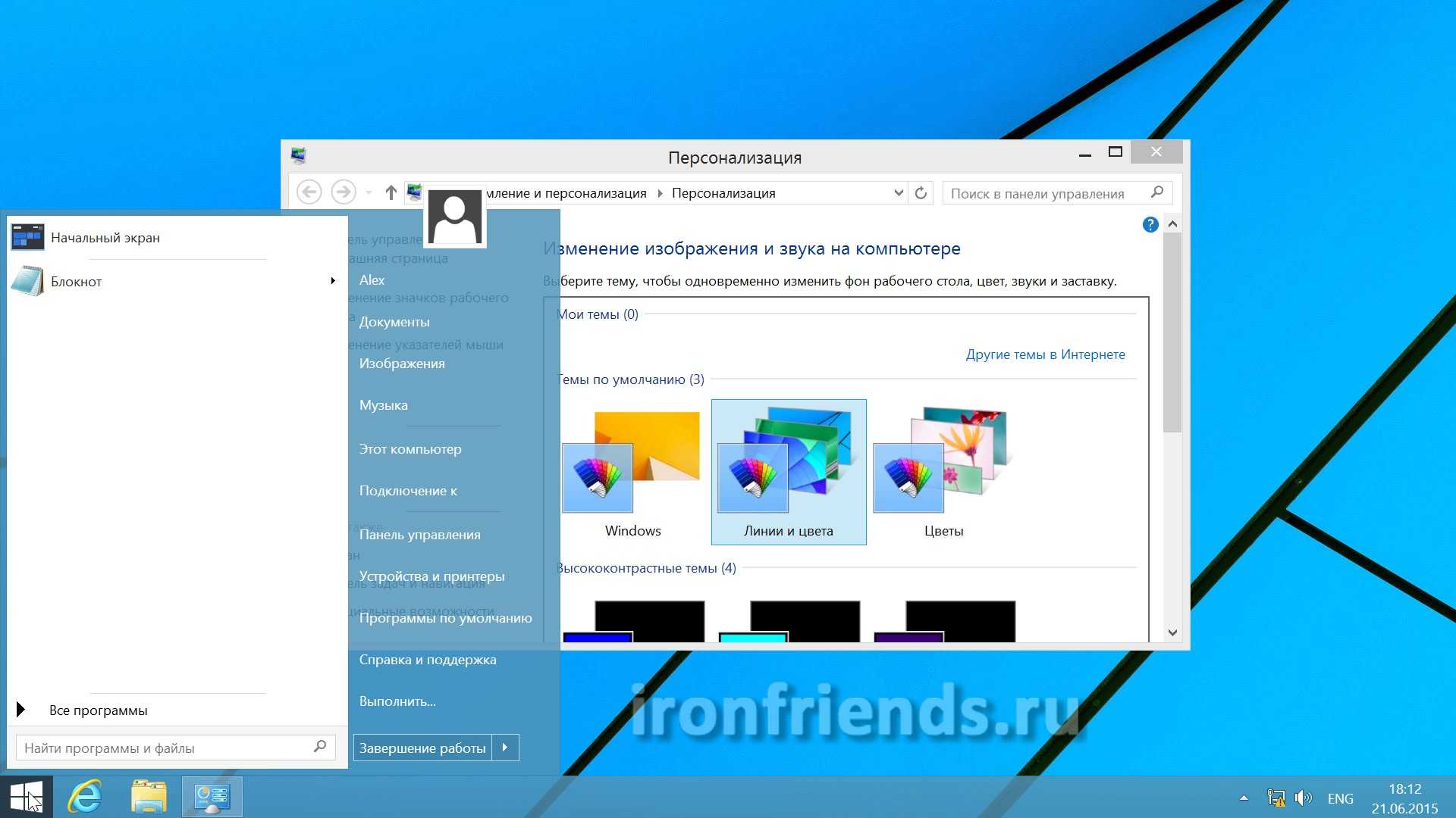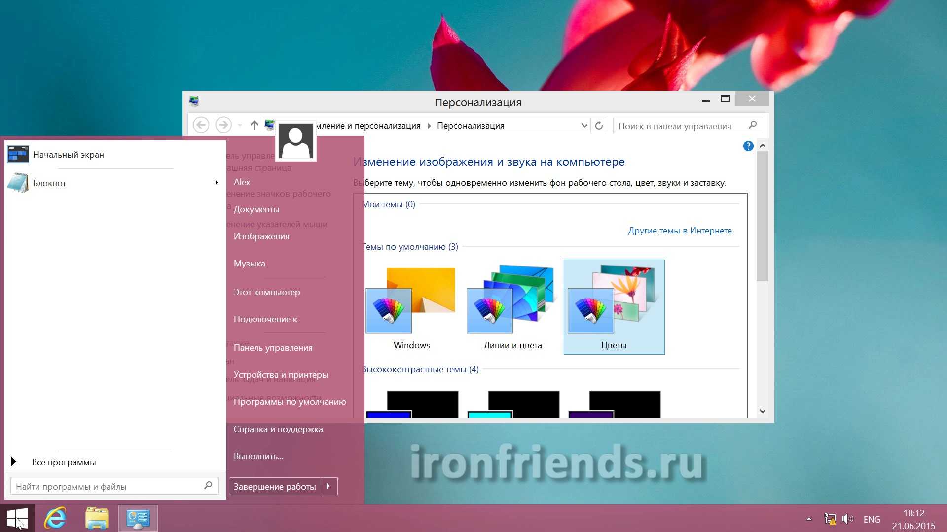 Интерфейс меню ПУСК хорошо адаптируется под цветовые темы Windows 8.1 и при выборе других тем выглядит значительно лучше.