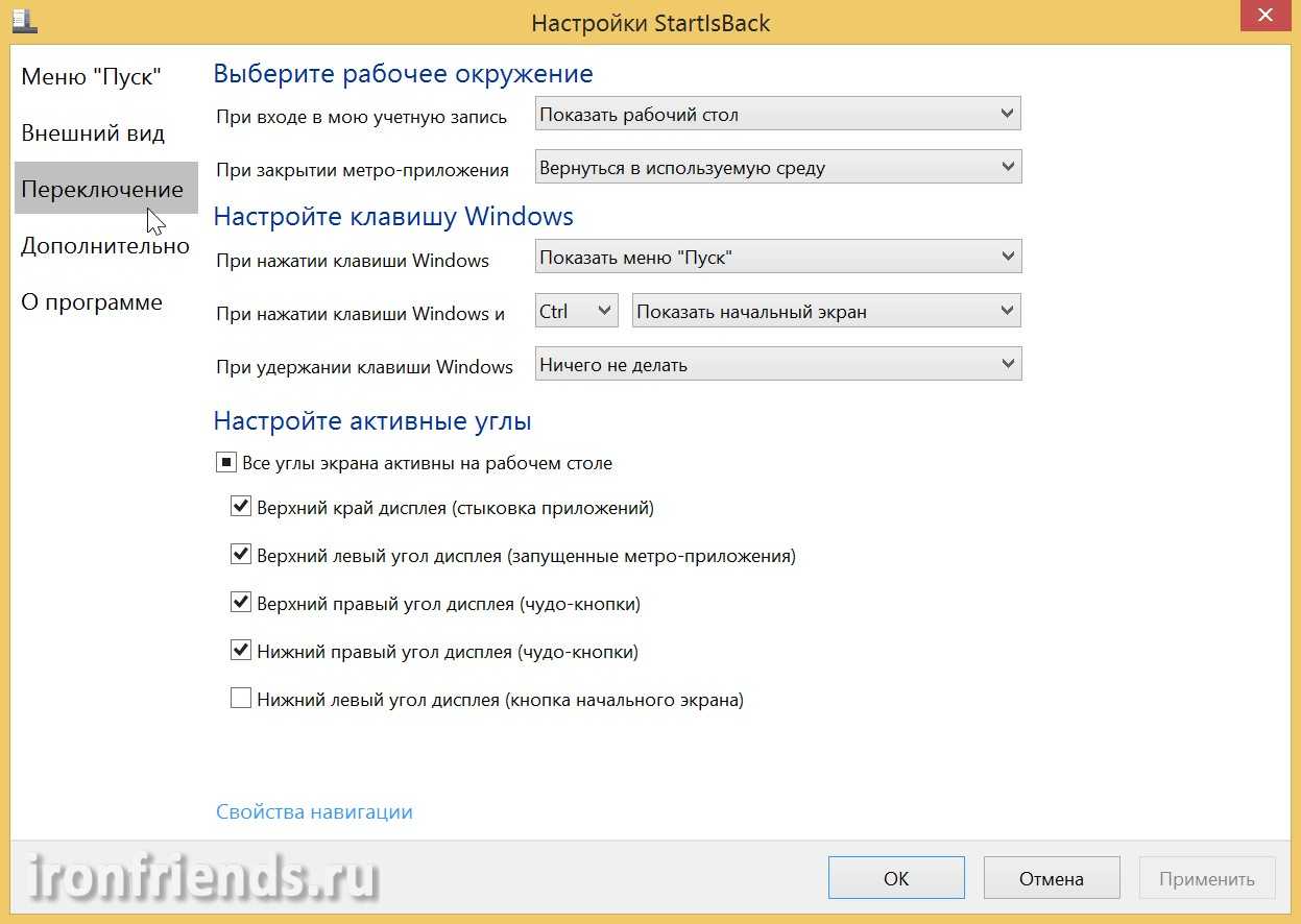 В данном разделе настроек вы можете выбрать, что загружать при входе в Windows — рабочий стол или же начальный экран, задать комбинации клавиш для быстрого перехода между рабочими средами, а также активировать или отключить активные углы Windows 8.1.