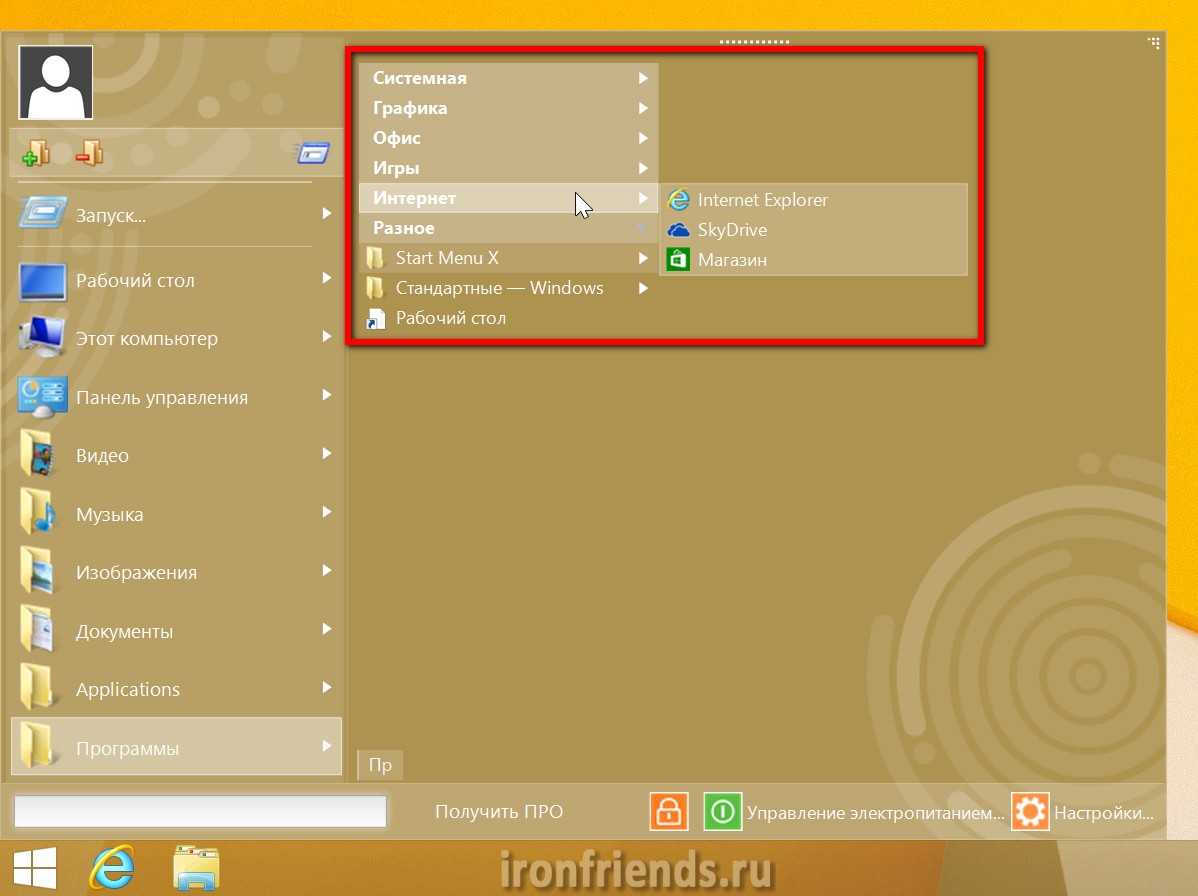 Меню ПУСК хорошо подстраивается под цветовые темы Windows 8.1, но в целом немного уступает в оформлении программе «Start8».