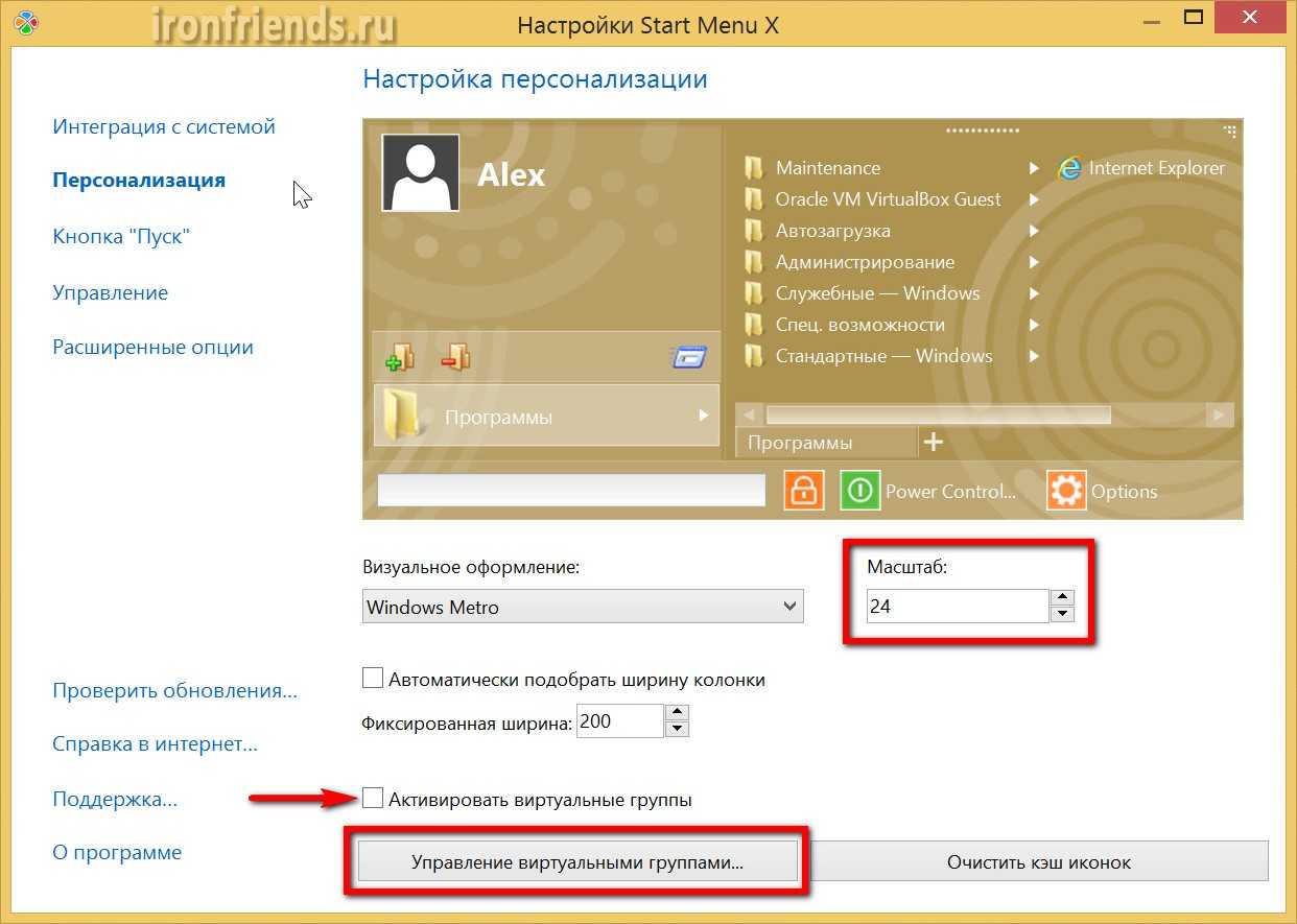 На следующей странице можно изменить тему на более страшную , задать ширину правой колонки и изменить значок кнопки ПУСК. Тут же имеется две уникальных опции – «Масштаб» и «Управление виртуальными группами».