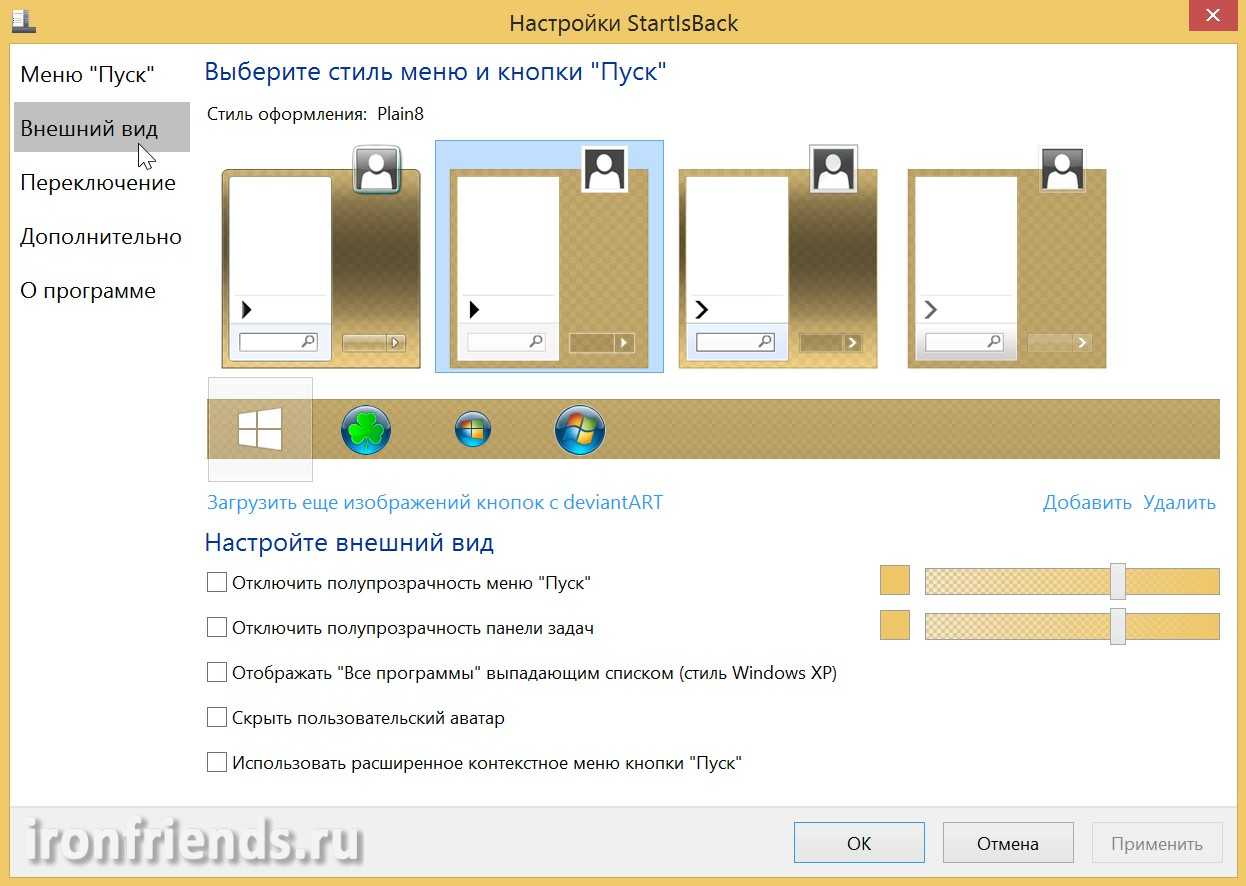 В настройках внешнего вида имеется возможность выбрать, какой именно стиль будет использоваться для меню и кнопки, загрузить дополнительные изображения кнопки пуск, а также некоторые другие детали.