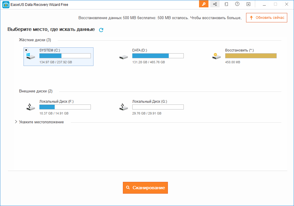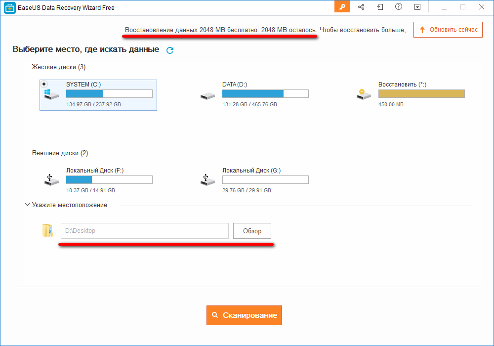Шаг 1. Запустите мастер восстановления данных EaseUS на компьютере. После чего укажите определённое место для поиска потерянных данных, будь то жесткий или внешний диск, USB-носитель, microSD карта или определенная папка на рабочем столе. Затем нажмите кнопку Сканировать.