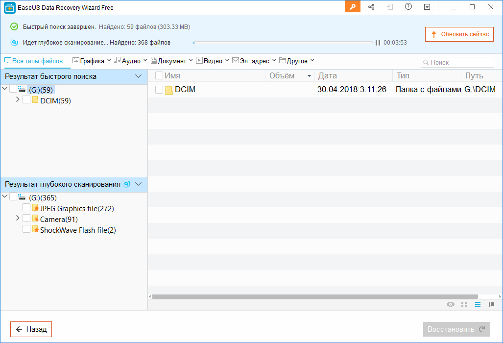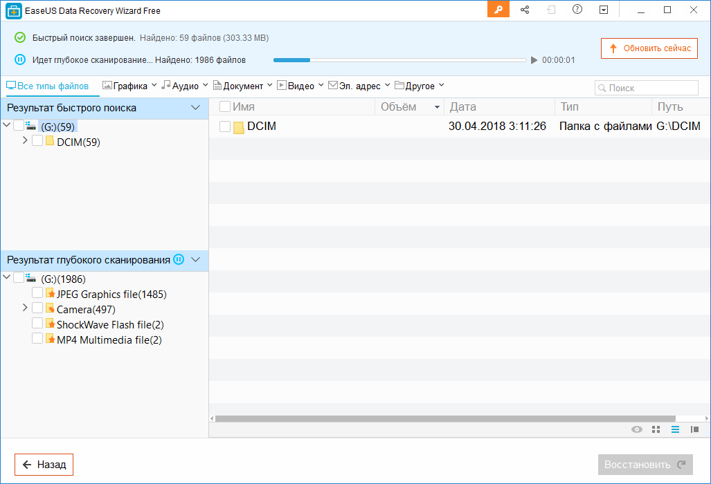 Сканирование в EaseUS Data Recovery Wizard Free проходит в два этапа: сначала запускается «Быстрый поиск», а затем идет «Глубокое сканирование», которое занимает больше времени, но находит больше файлов. При настройке по умолчанию, программа ищет все типы файлов.