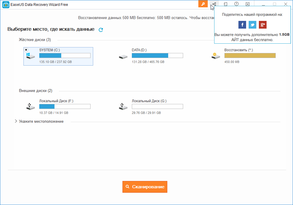 Изначально в бесплатной версии доступно 500 Мб для восстановления, но поделившись ссылкой на программу в соцсети, можно получить еще 1.5 Гб, чего во многих случаях может быть достаточно.
