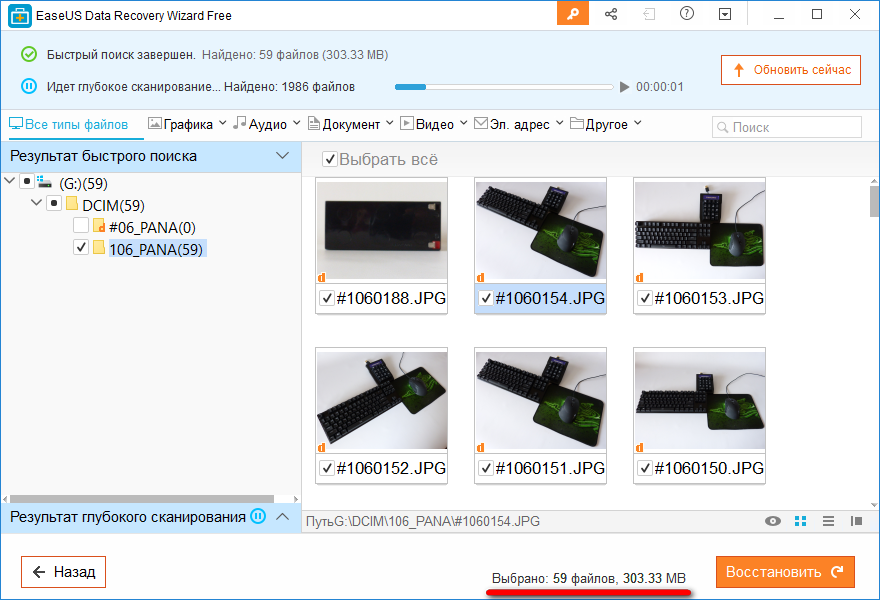 Я выбрал для поиска удаленных файлов фотоаппарат, на котором перед каждой новой фотосъемкой произвожу очистку карты памяти. Программа быстро произвела сканирование и обнаружила 59 удаленных файлов.