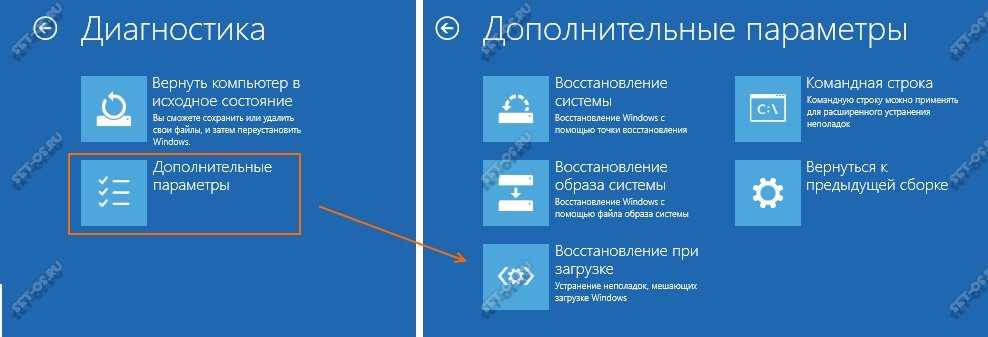 В меню диагностического режима перейдите в «Дополнительные параметры». Здесь будут показаны все доступные средства устранения проблем при загрузке Виндовс — выбирайте тот, который соответствует Вашей ситуации. Чаще всего это или устранение неполадок, препятствующих нормальному запуску ОС, либо восстановление системы используя имеющиеся точки восстановления. В некоторых случаях придётся использовать командную строку. Как показывает практика, если причина возникновения проблемы не в аппаратная, то достаточно часто удаётся восстановить нормальный запуск ОС, что позволит хотя бы скопировать нужные файлы с системного диска.