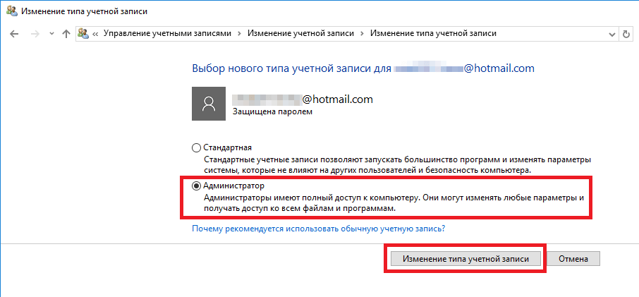 После выполнения действий выше тип учетной записи будет переключен на администраторскую или обычную в зависимости от выбора.
