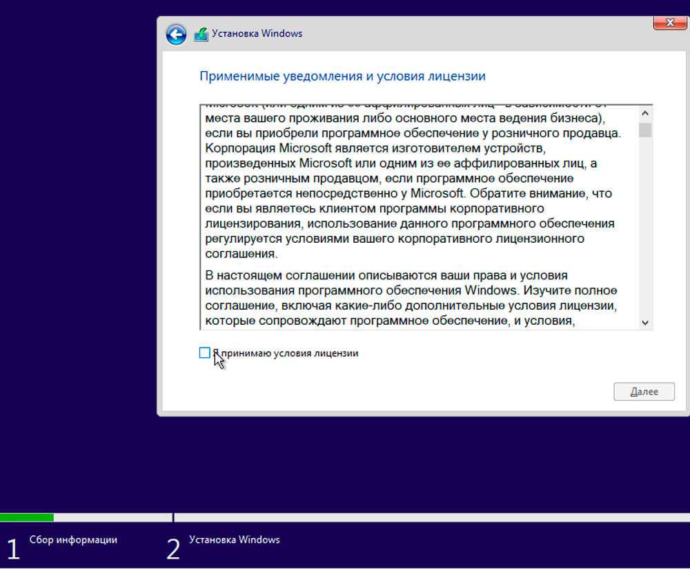 Установку вы сможете продолжить лишь после того, как подтвердите свое согласие, поставив «птичку» перед надписью «Я принимаю условия лицензии». «Далее».