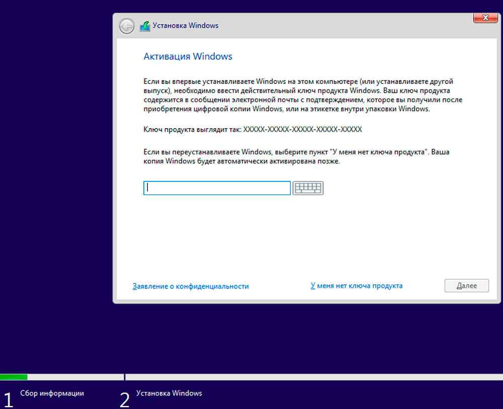 Введите ключ активации системы. Если на данный момент он у вас отсутствует, выберите пункт «У меня нет ключа активации». Вы сможете активировать систему потом.