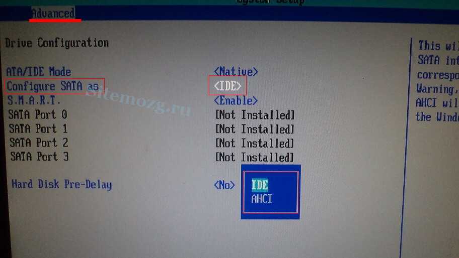 Войдите в BIOS и найдите настройку «Configure SATA as» (у вас может быть немного другое название, ищите с похожим словом). Предварительно на некоторых версиях БИОС нужно отключить «Secure Boot». Переключите параметр на другой.