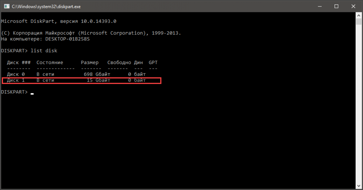 Введите команду diskpart в черном окне и нажмите клавишу Enter. Теперь введите команду list disk. Вы увидите список всех дисков и подключенных запоминающих устройств на вашем компьютере.