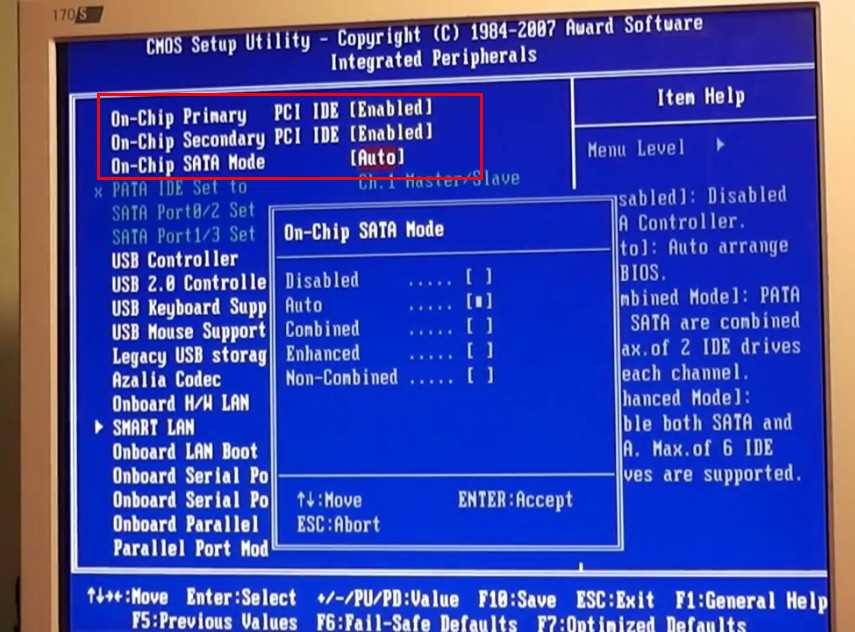 В Award BIOS вам нужно зайти в раздел Integrated Peripherals и убедиться, что параметры On Chip Primary PCI IDE и On Chip Secondary PCI IDE включены (Enabled), а параметр On Chip SATA Mode установлен в режим Auto.