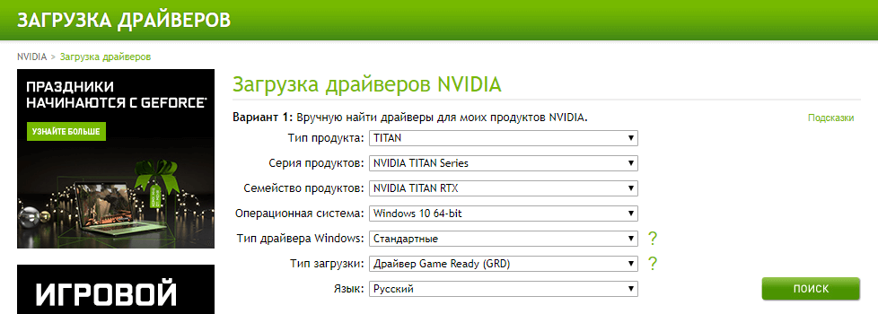 - NVidia. Драйвера от NVidia называются WHQL и расположены по адресу nvidia.ru/Download.