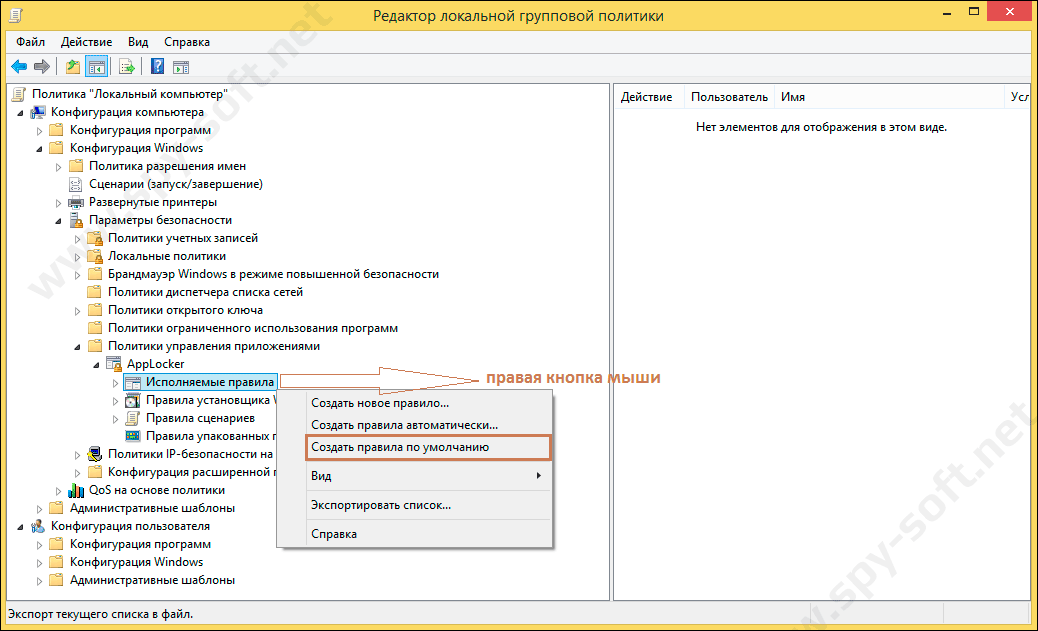 1. Нажав на ветвь Исполняемые правила, мы увидим, что их собственно нет. Поэтому сначала, я рекомендую создать стандартные правила.