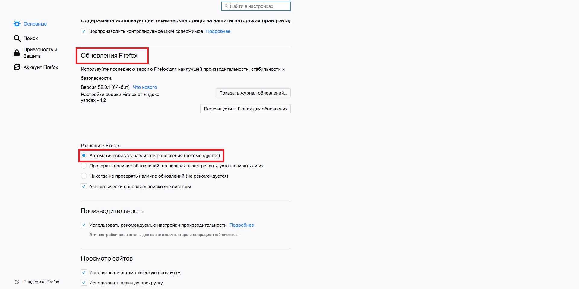 Запустите браузер. Найдите пункт «Настройки» → «Основные» → «Обновление Firefox» → «Автоматически устанавливать обновления».